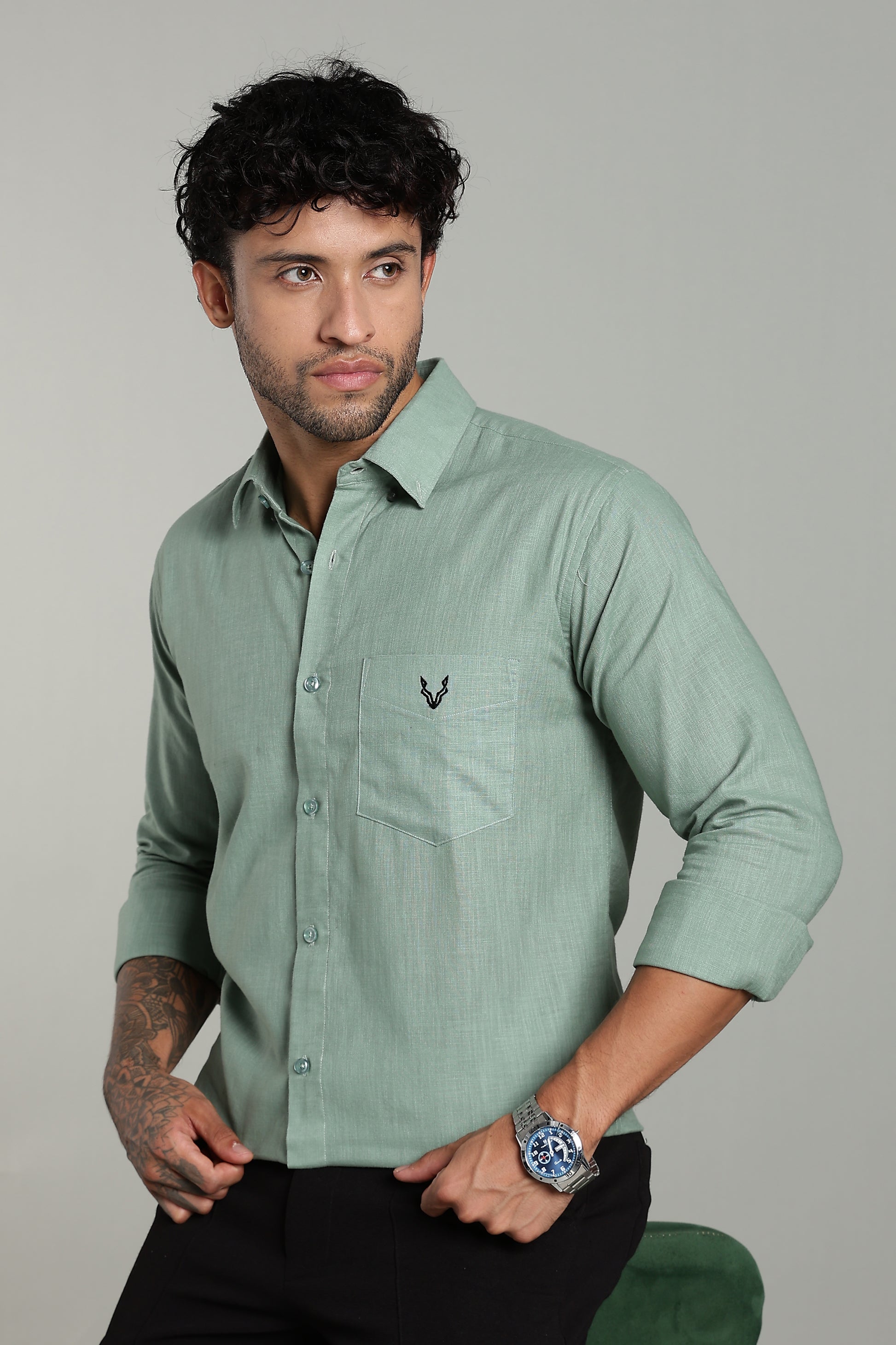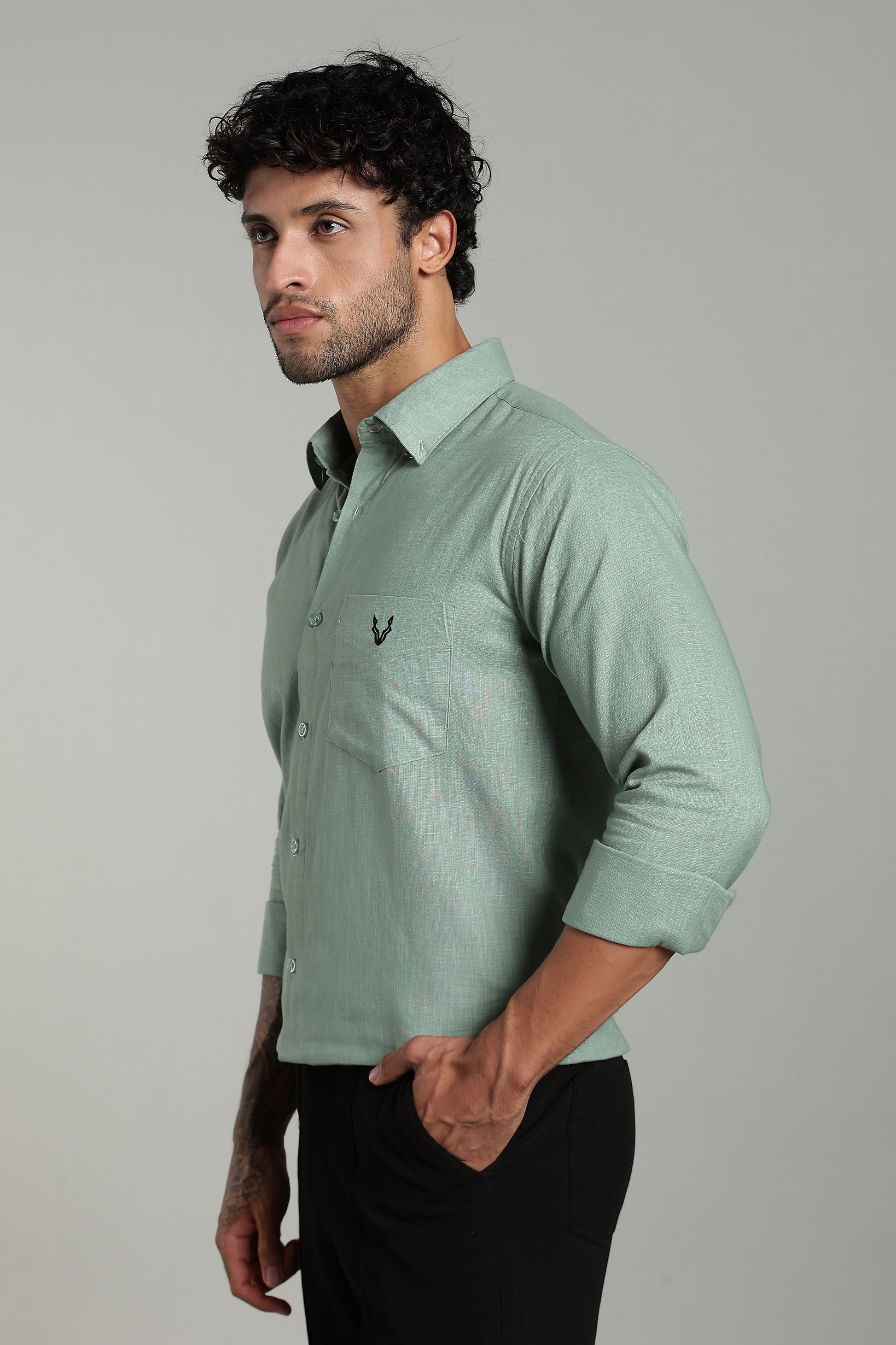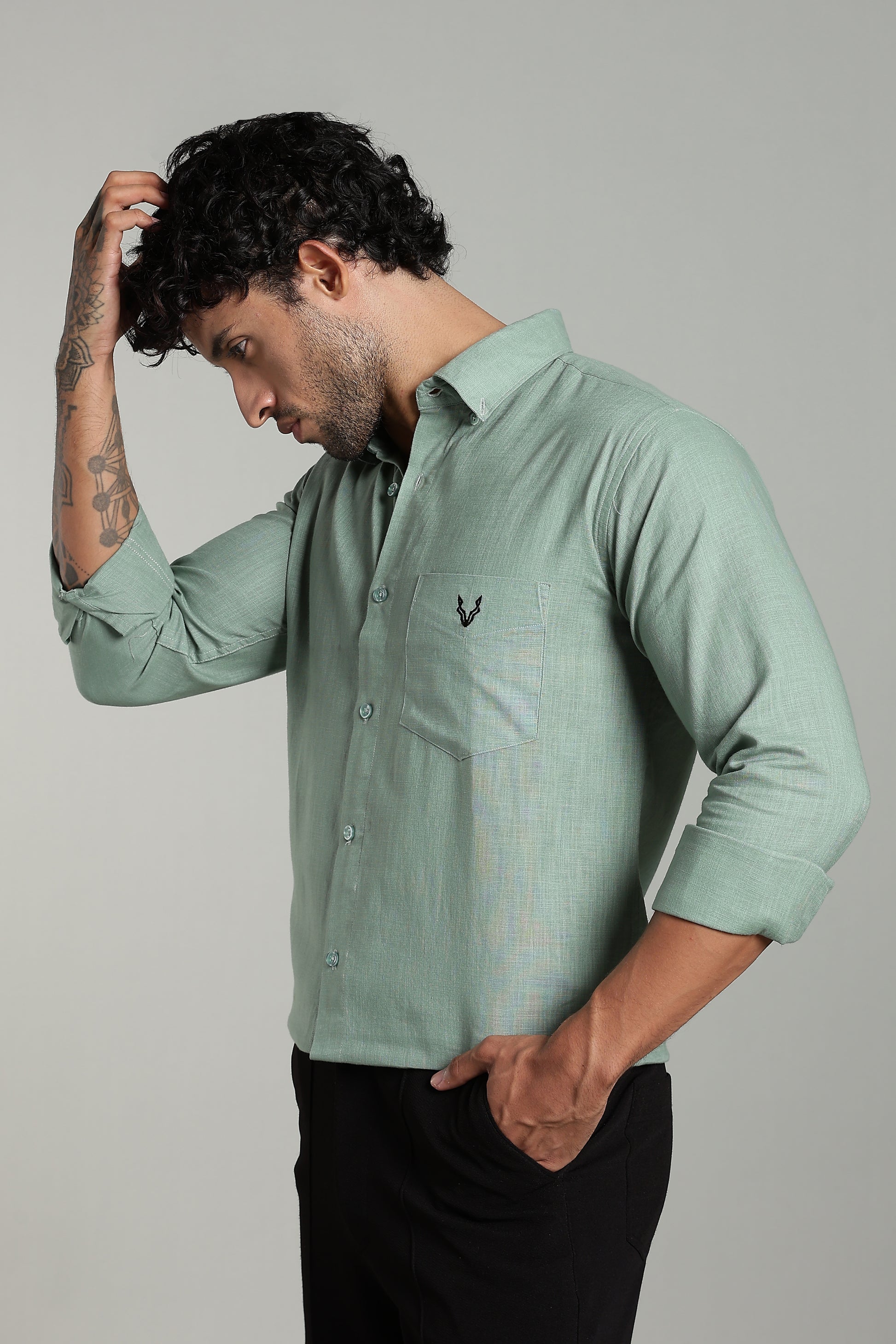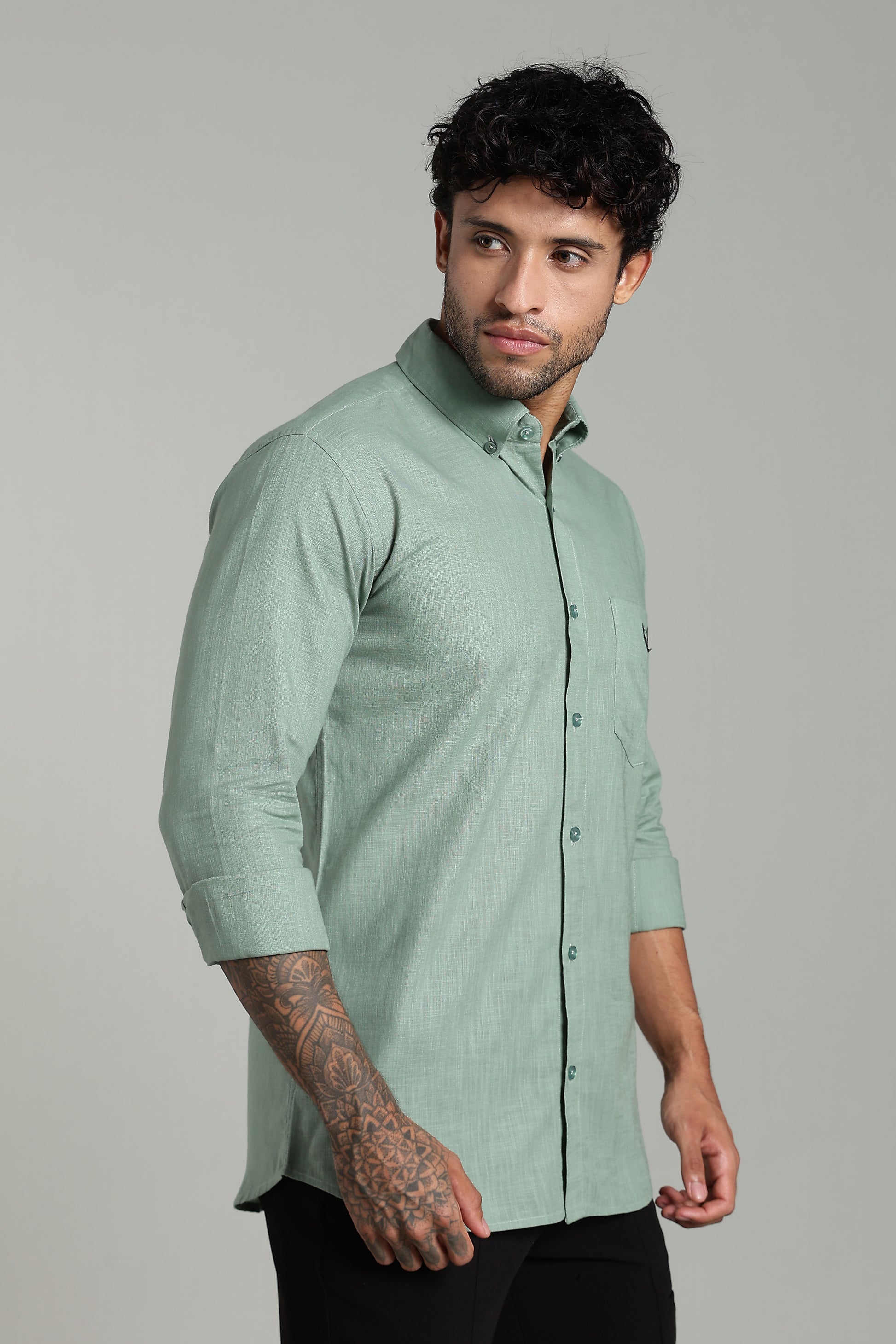 Elevate your formal style with this light sky-blue textured shirt, crafted from a premium cotton-linen blend. Designed for comfort and sophistication, it features a button-down collar, full sleeves, and a subtle chest logo for a refined touch.