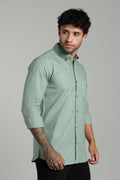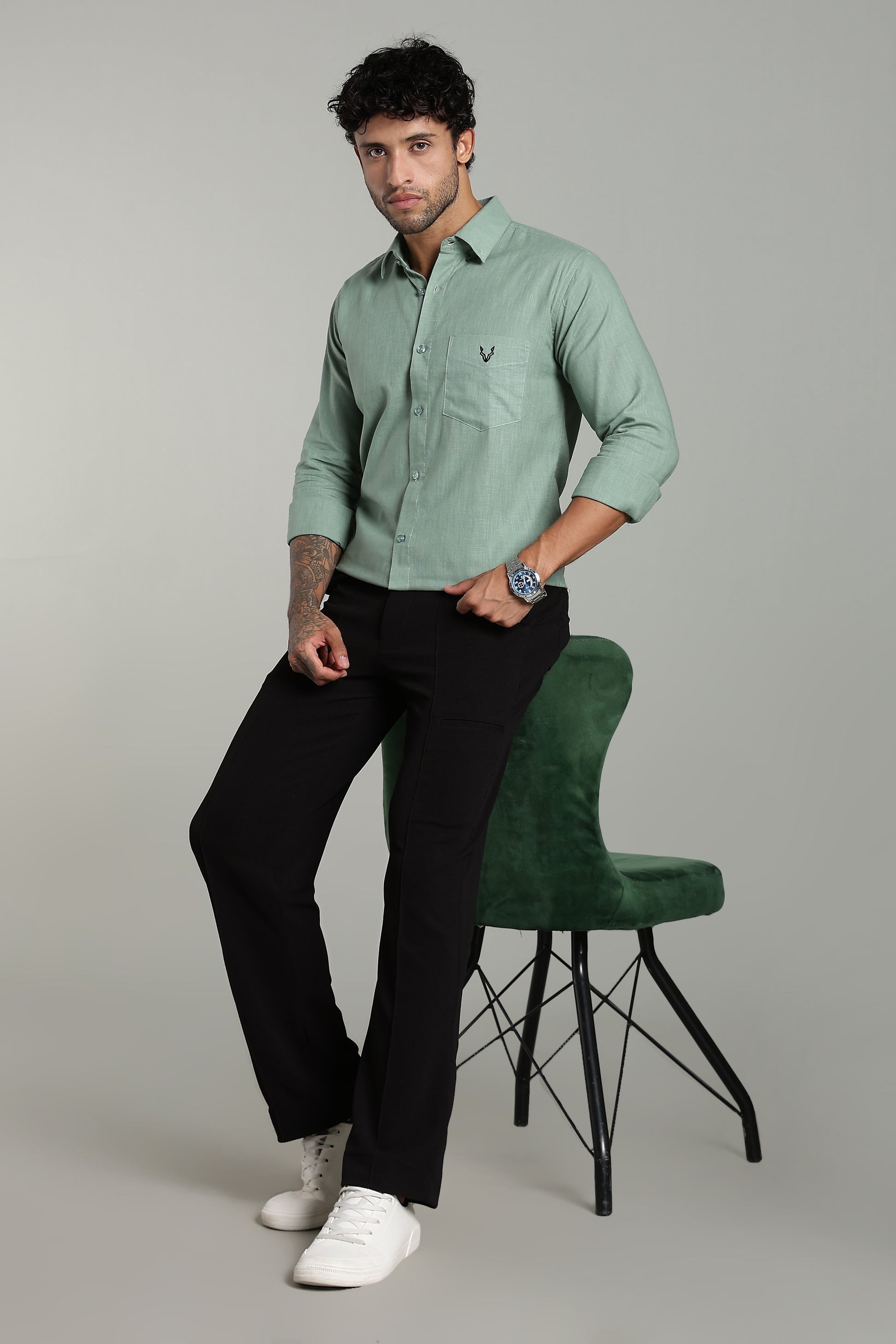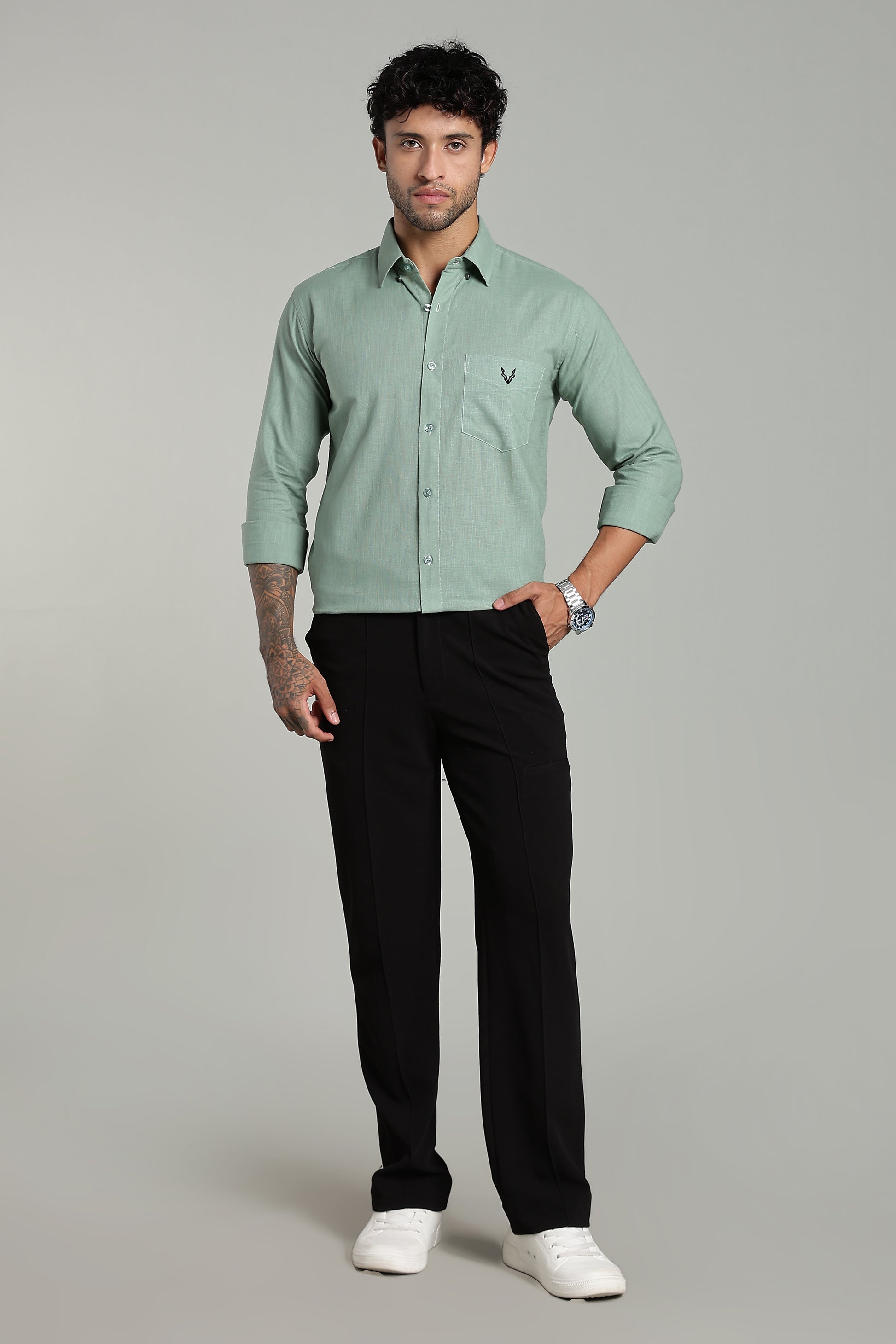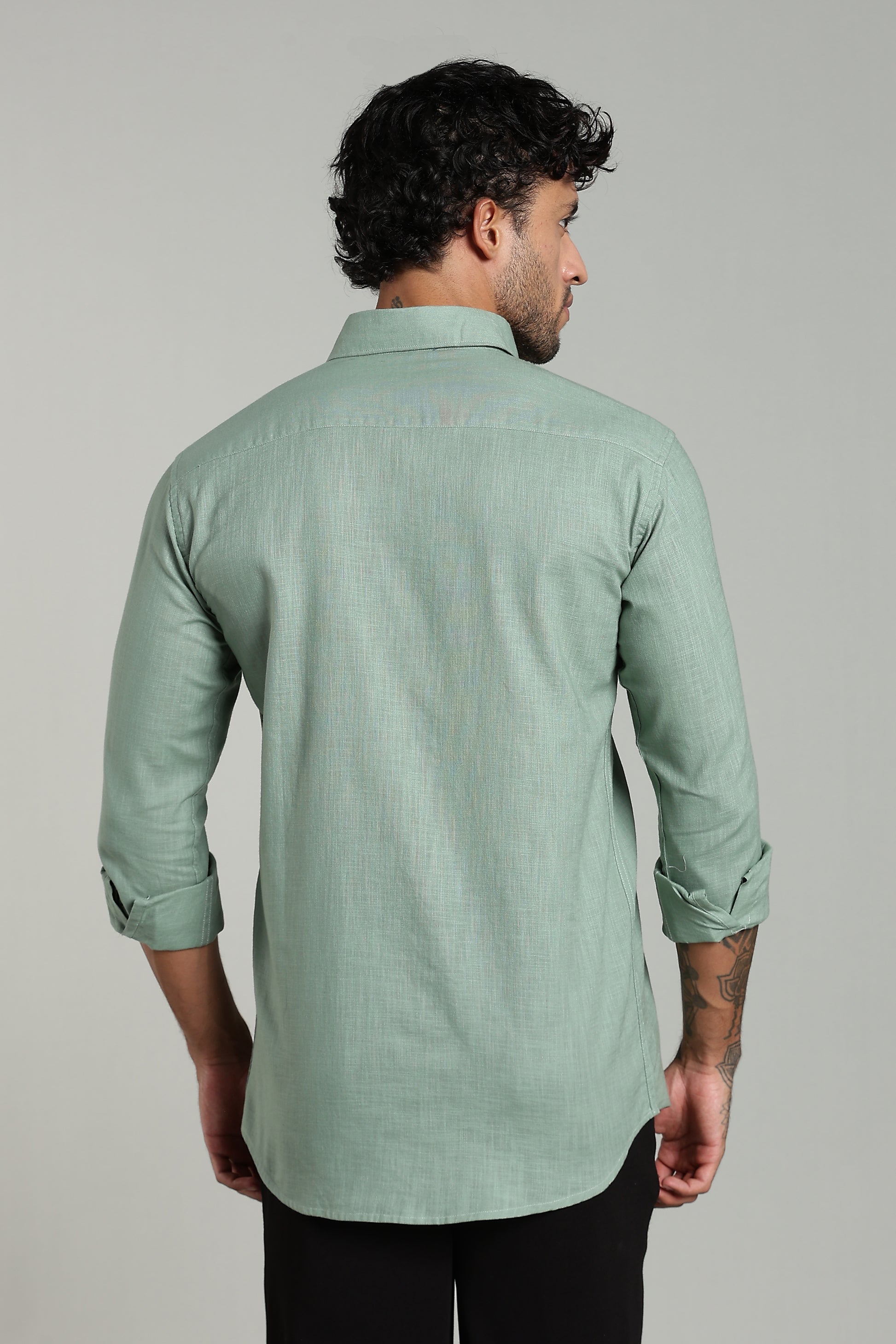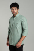Elevate your formal style with this light sky-blue textured shirt, crafted from a premium cotton-linen blend. Designed for comfort and sophistication, it features a button-down collar, full sleeves, and a subtle chest logo for a refined touch.