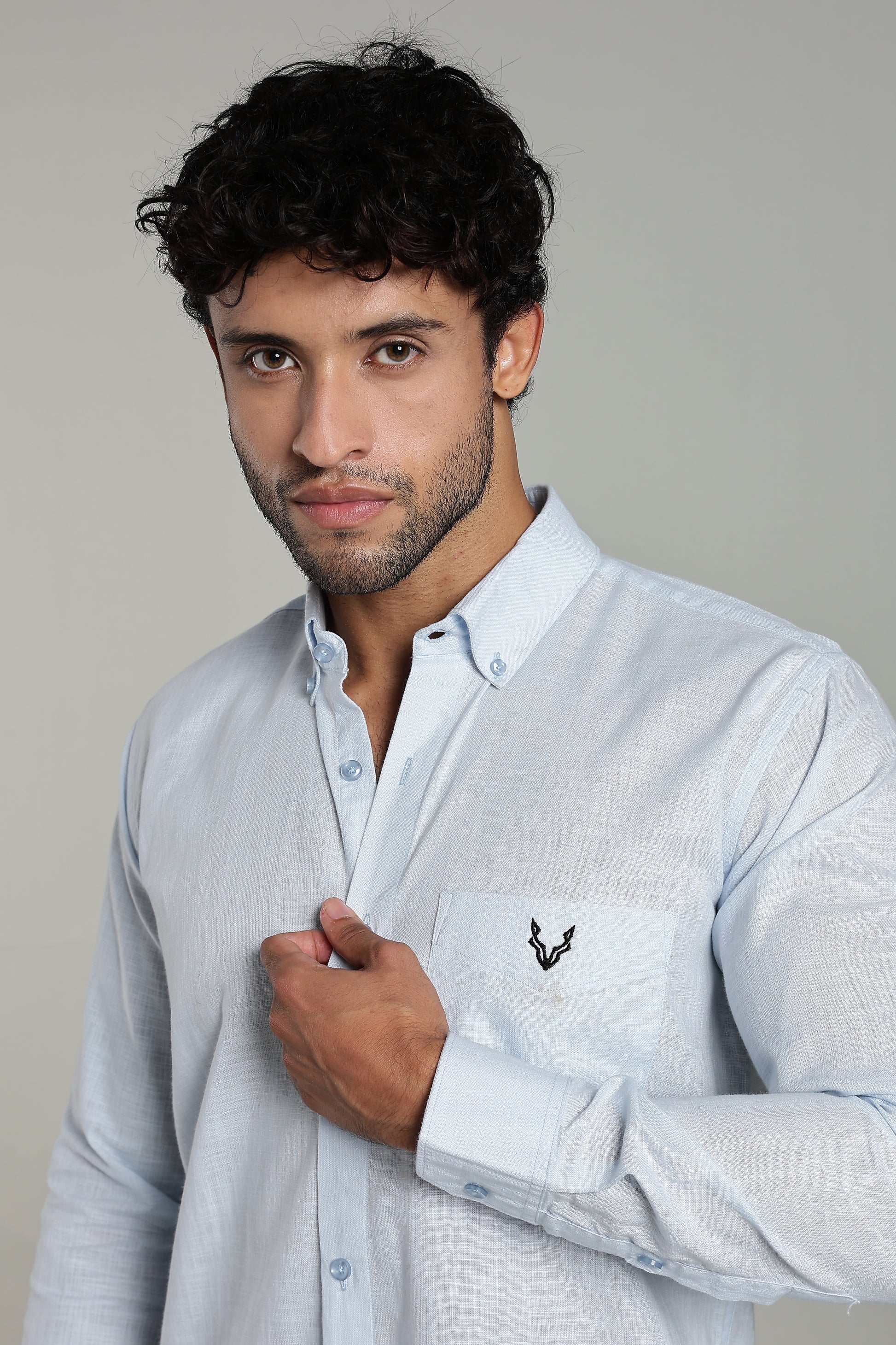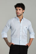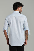 Elevate your formal style with this light sky-blue textured shirt, crafted from a premium cotton-linen blend. Designed for comfort and sophistication, it features a button-down collar, full sleeves, and a subtle chest logo for a refined touch.